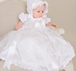 - The 3-piece set includes a gown, cotton slip, and bonnet