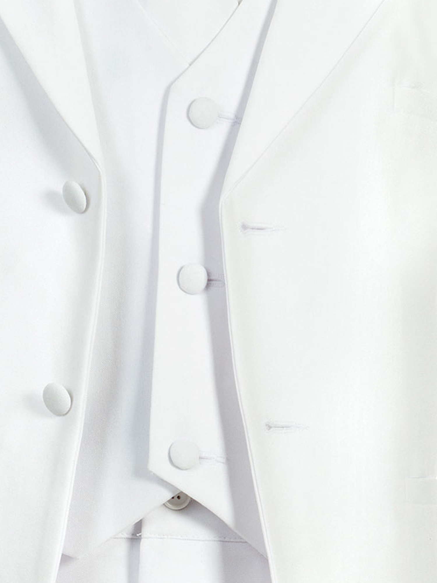 Standard single breasted notched lapel jacket, complete with two fabric covered buttons and three welt pockets. Fully lined vest with three fabric covered buttons. Pleated full length dress pants with an elastic waistband for a comfortable fit. Long sleeve white dress shirt with a lay down collar. Clip-in-back adjustable neck tie. Perfect for holidays, birthday parties, christening day, church, or any other special occasion. Pants sizes 5 – 20 have elastic bands as well as a zipper and button closure.