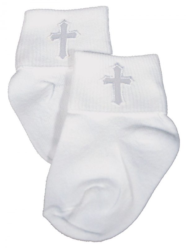 White 100% cotton fine gauge plain anklet christening sock with embroidered cross applique for use with any of our boys Christening Sets. Size: NB, SM, MD, 1-2, 3-5, 6-8, and 9-11. See size chart in images for measurements. (2005CR) (2005YC)