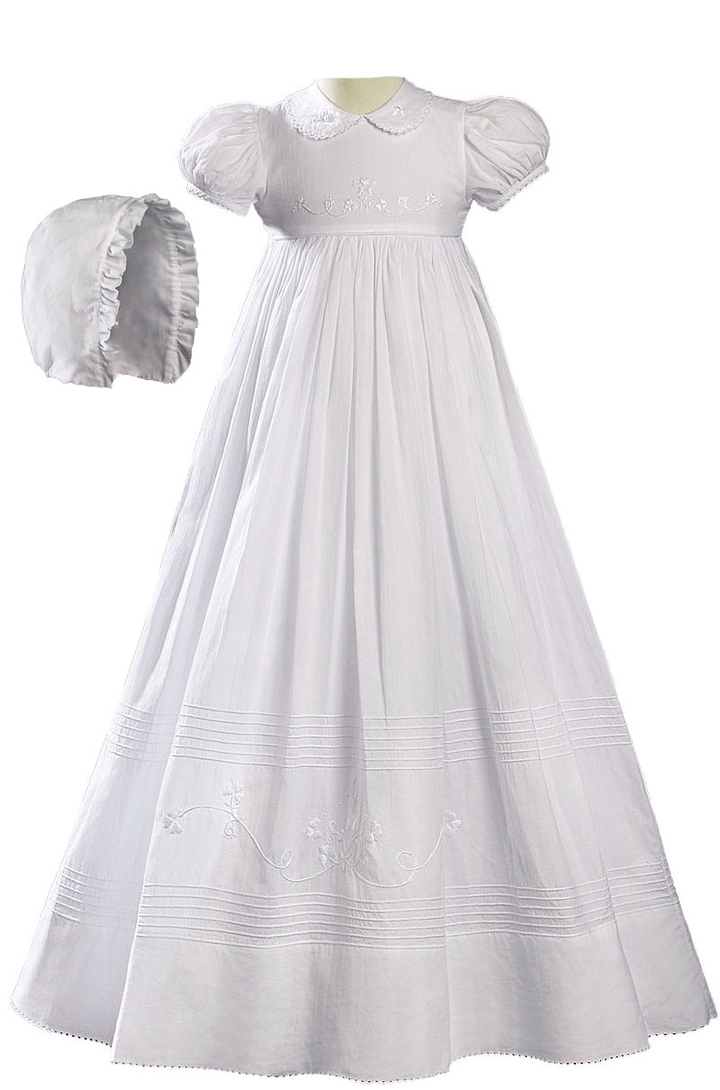 This beautiful all white christening/baptismal gown is perfect for any special occasion such a wedding, church presentation, dedication and keepsake photos. Beautiful 32″ heirloom christening gown. Hand floral shamrock embroidery on bodice, sleeves and skirt. Includes matching bonnet and attached slip. Hand made and hand embroidered. 100% Cotton Broadcloth. Hand wash. Shipped with elegant padded hanger and zippered vinyl bag. Heirloom Preservation Bag recommended for long term storage. Sizes: 3, 6, and 12 month. (CASHGS)